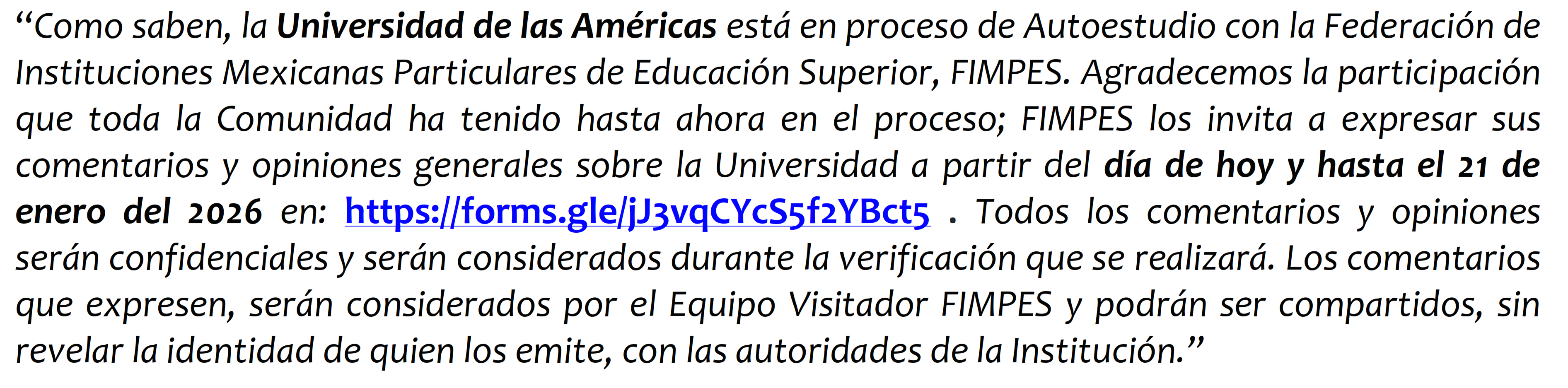 La Universidad de las Américas, A.C. está acreditada por la Southern Association of Colleges and Schools Commission on Colleges (SACSCOC) para impartir programas de Licenciatura, Maestría y Doctorado. La Universidad de las Américas, A.C. también puede ofrecer credenciales como certificados y diplomas en niveles de grado aprobados. Preguntas sobre la acreditación de la Universidad de las Américas, A.C. pueden dirigirse por escrito a la Commission on Colleges en 1866 Southern Lane, Decatur, Georgia 30033-4097, llamando al 404-679-4500, o consultando la información disponible en el sitio web de SACSCOC (www.sacscoc.org)